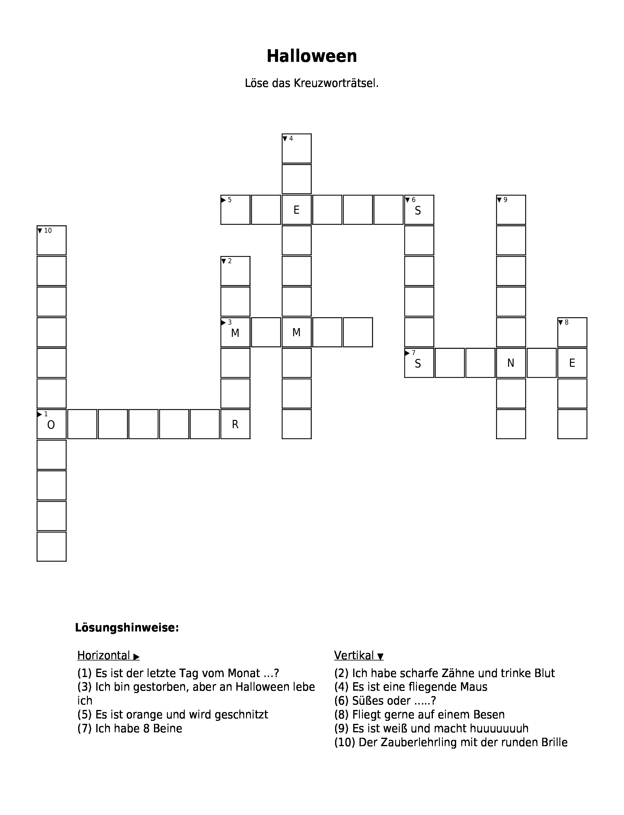 • Im Kreuzworträtsel Halloween sind 10 Aufgaben (Fragen & Antworten) eingetragen.